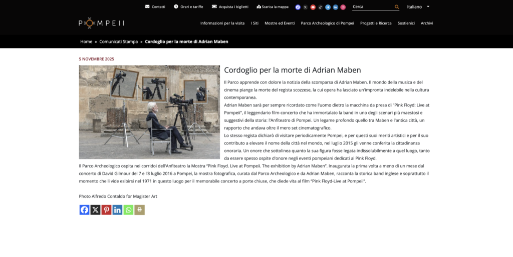 Il Parco archeologico di Pompei saluta con profonda commozione Adrian Maben, il regista scozzese che trasformò l’Anfiteatro pompeiano in uno dei palcoscenici più iconici della storia della musica.