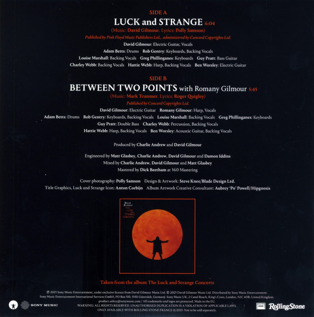 Pubblicato esclusivamente in Francia e allegato all’edizione francese della rivista Rolling Stone (n. 177, novembre 2025), è uscito il 14 novembre 2025 un 45 giri tratto dall’album Live From The Luck And Strange Concerts di David Gilmour.