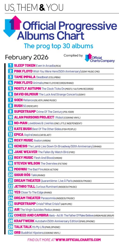 Nelle edicole britanniche è disponibile da qualche giorno il numero 168 del mensile Prog Magazine, datato 6 marzo 2026. Come ogni mese, la rivista propone ai lettori la Official Progressive Albums Chart, la classifica dei 30 album prog più venduti.