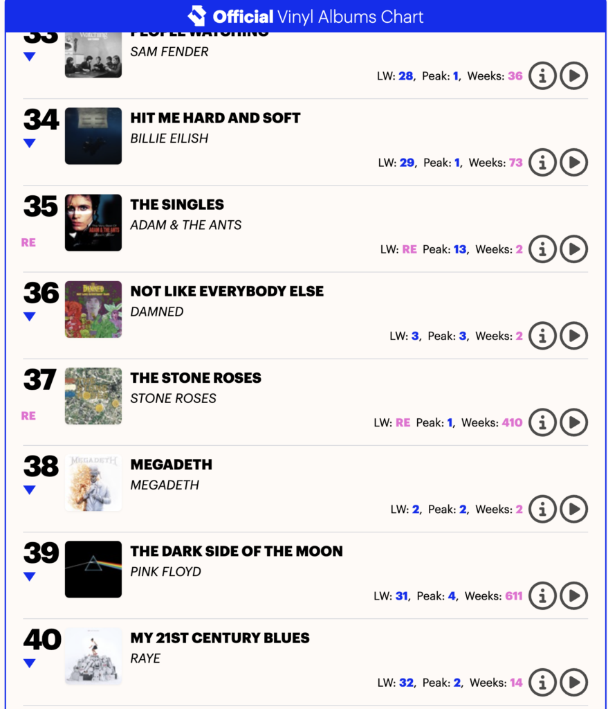 La classifica, compilata dalla Official Charts Company, riguarda gli album in vinile più venduti ufficialmente nel Regno Unito della settimana in base alle vendite in un periodo di sette giorni.
