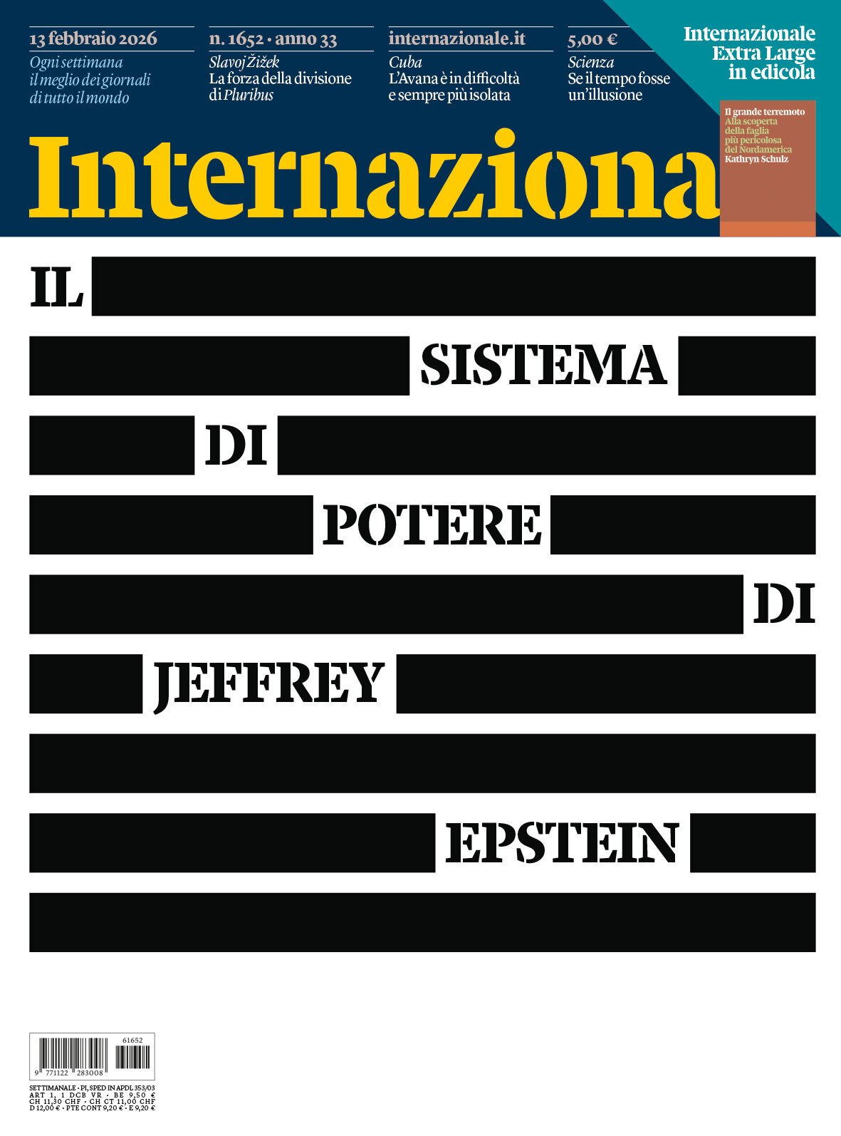 Il nuovo numero del settimanale “Internazionale” (13 febbraio 2026, n. 1652, anno 33) presenta una copertina che richiama la celebre tecnica delle “cancellature” dell’artista siciliano. La stessa soluzione visiva era stata utilizzata nel 2017 da Roger Waters per la copertina del suo album “Is This The Life We Really Want?”.